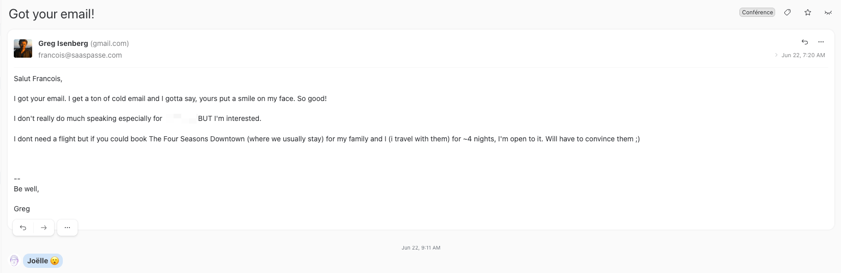 J'ai crafté mon email avec cette citation en ouverture comme point d'ancrage. Pas dans une intro générique du genre "Hey, j'ai vu que tu as déjà vécu à Montréal."