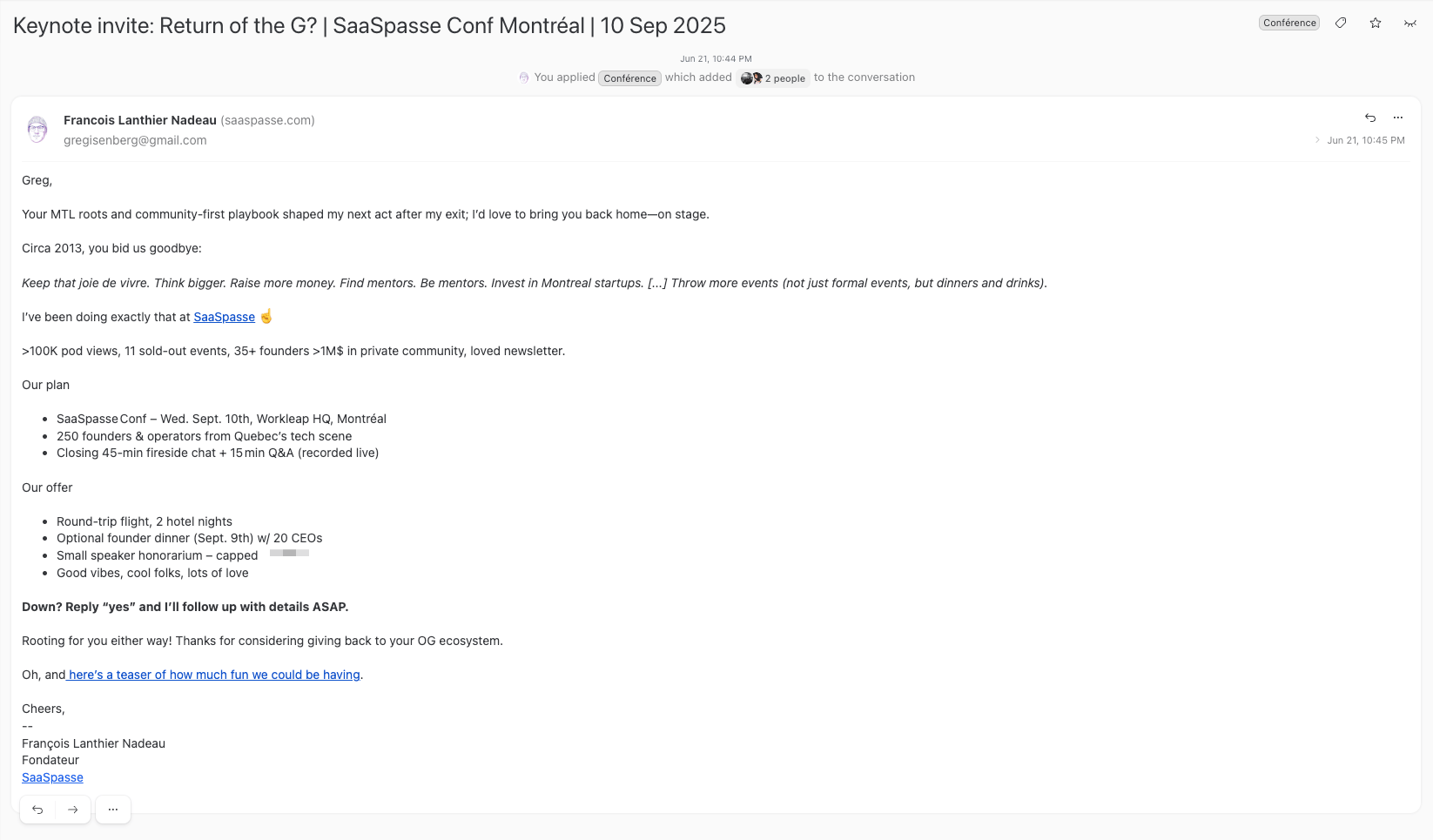 Greg Isenberg comme tĂȘte d'affiche pour notre premiĂšre conf annuelle? Ăa vaut le trade-off. C'est un gars qui a des millions de followers, qui a bĂąti sa rĂ©putation ici Ă MontrĂ©al. Le ramener "home" pour clĂŽturer notre Ă©vĂ©nement, câest symbolique et puissant.